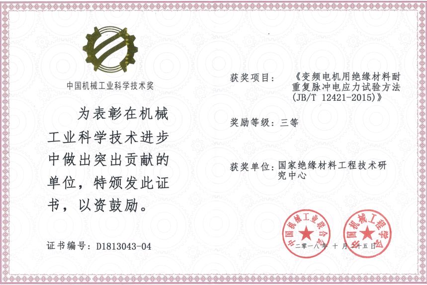 由中國(guó)機(jī)械工業(yè)聯(lián)合會(huì)和中國(guó)機(jī)械工程學(xué)會(huì)共同設(shè)立“中國(guó)機(jī)械工業(yè)科學(xué)技術(shù)獎(jiǎng)”,是中國(guó)機(jī)械領(lǐng)域最具權(quán)威的獎(jiǎng)項(xiàng)之一。近日,2018年度中國(guó)機(jī)械工業(yè)科學(xué)技術(shù)獎(jiǎng)獲獎(jiǎng)項(xiàng)目公布,我公司(國(guó)家絕緣材料工程技術(shù)研究中心)參與制定的行業(yè)標(biāo)準(zhǔn)JB/T12421-2015《變頻電機(jī)用絕緣材料耐重復(fù)脈沖電應(yīng)力試驗(yàn)方法》榮獲 ...
